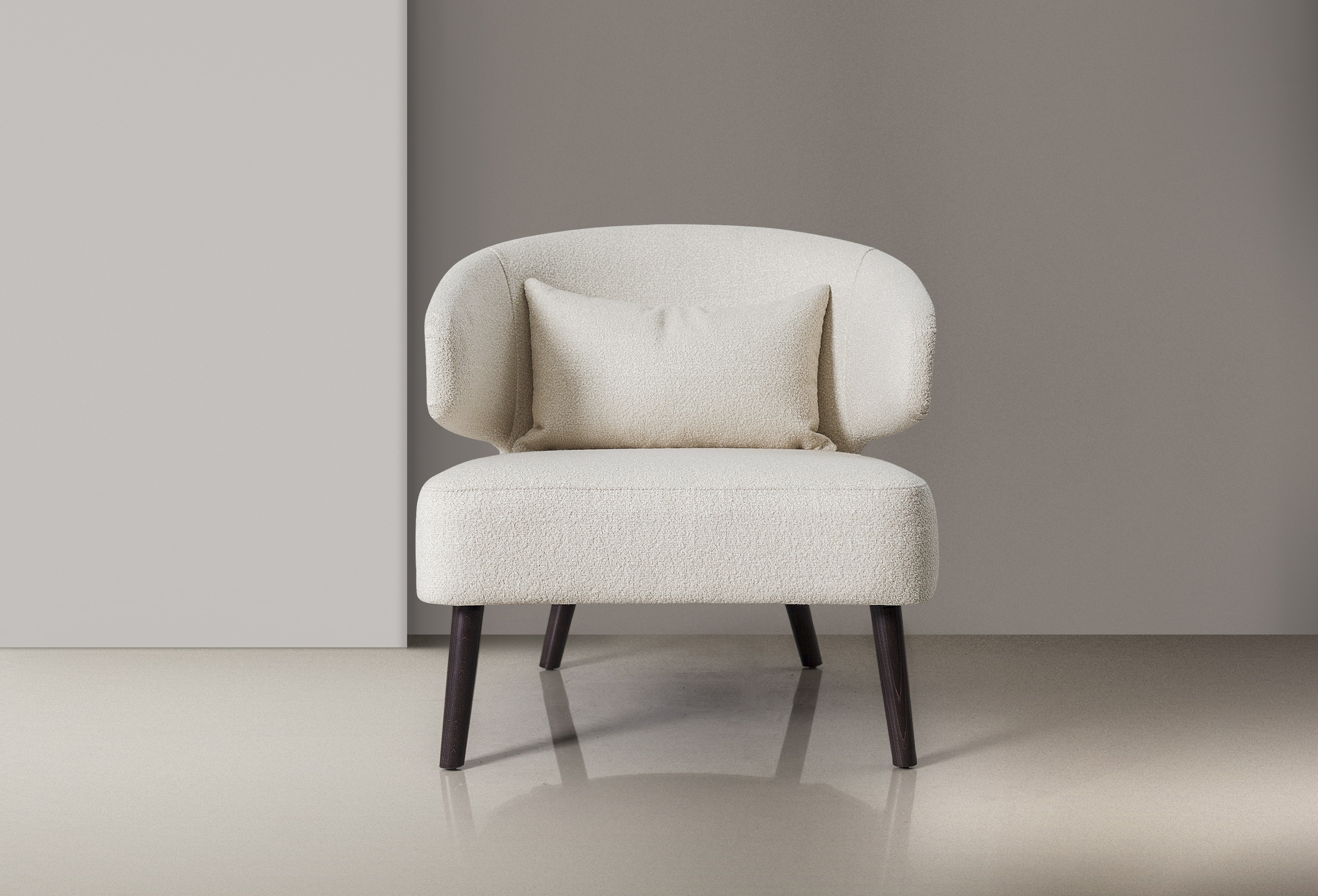Кресло с обволакивающими формами, дополнено мягкой подушкой для максимального комфорта. Идеально подходит для современных интерьеров.