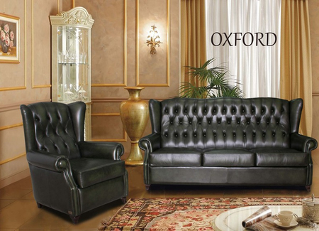 Диван и кресло выполнены в классическом английском стиле, боковые стенки моделей выполнены в форме «ушек», что придает этой модели некий шарм, спинка украшена капитонами. По форме "Оксфорд" напоминает кресло "Берже", но в новой модели спинка сиденья выше, а глубина посадки больше, что позволяет более комфортно разместиться.