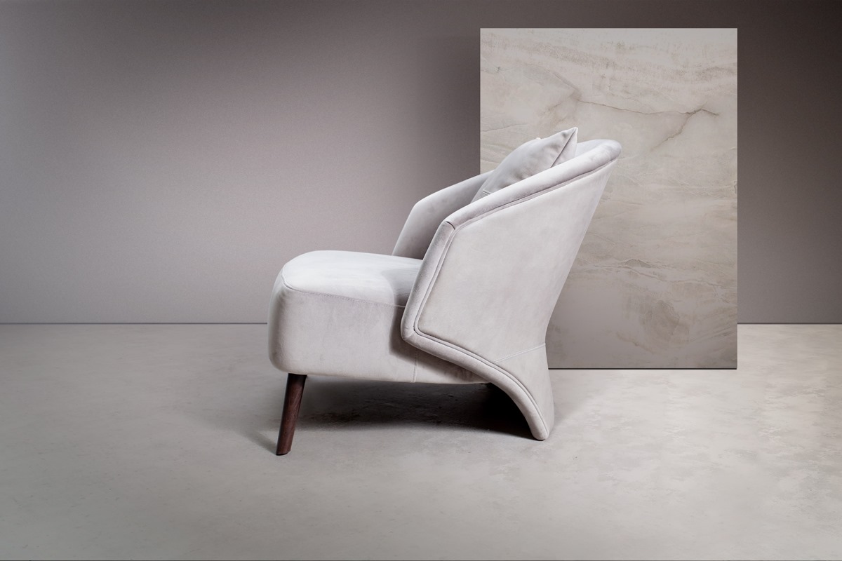 Кресло с изогнутой спинкой и обволакивающими формами, дополнено мягкой подушкой для комфорта. Идеально подходит для современных интерьеров.